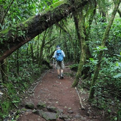 After breakfast, a steady descent takes us down through moorland to Mandara Hut (2700m / 8858 ft), the first stopping place at the Marangu route. Continue descending through lovely lush forest on a good path to the National Park gate at Marangu (1830 m / 6004 ft). At lower elevations, it can be wet and muddy. Gaiters and trekking poles will help. Shorts and t-shirts will probably be plenty to wear (keep rain gear and warmer clothing handy).